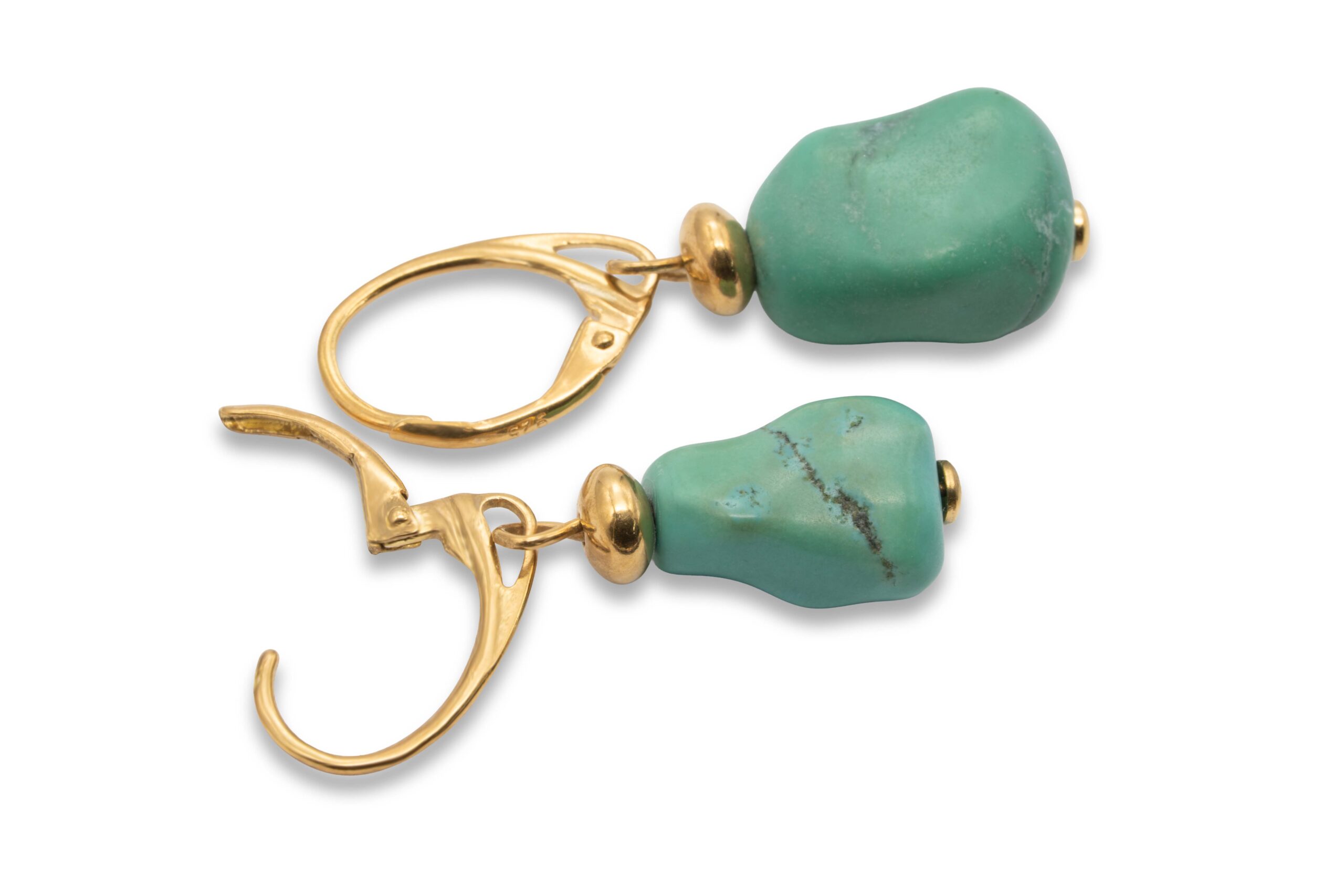 Außergewöhnliche Ohrhänger mit Türkis in Silber, vergoldet: Die Kombination aus Türkis und Gold wirkt klassisch und modern zugleich, außerdem erinnert sie an traditionelle Schmuckgestaltung, dennoch bleibt das Design klar und zeitgemäß. Diese Ohrringe eignen sich auch hervorragend als Geschenk, denn sie verbinden Handwerk, Natürlichkeit und Stil, und genau das macht sie zu etwas Besonderem. Wer Schmuck mit Charakter sucht, trifft hier eine bewusste Wahl, denn jedes Detail erfüllt sowohl eine ästhetische als auch eine funktionale Aufgabe, sodass Schmuck entsteht, der Freude bereitet und lange begleitet.