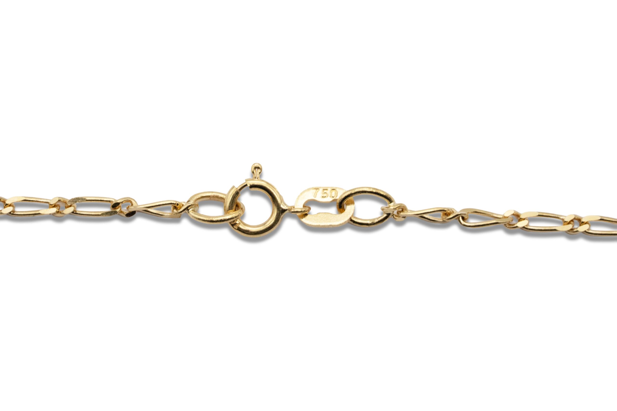 Die Figaro-Struktur zeichnet sich durch den Wechsel aus längeren und kürzeren Kettengliedern aus, wodurch ein lebendiges und rhythmisches Erscheinungsbild entsteht. Gleichzeitig bleibt das Design ruhig und ausgewogen, denn die Glieder sind gleichmäßig gearbeitet und sauber verarbeitet. Dadurch reflektiert die Oberfläche das Licht dezent, sodass ein warmer, goldener Glanz entsteht.